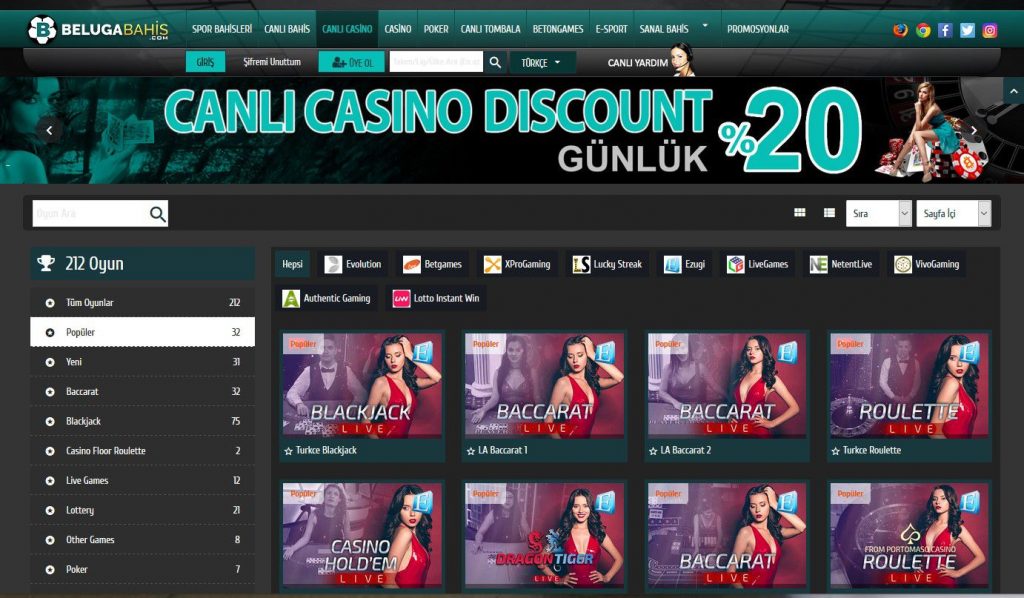 Beluga bahis, oyun severler için en popüler sitelerden biridir. Bunun ana sebebi Beluga bahis casino oyunlarının kalitesidir. Netent, Evolution Gaming, Quickspin, Micro Gaming, Ezugi şirketleriyle çalıştı ve yüzlerce farklı oyun siteye yerleştirildi. Belugabet, kurmacamın casino oyunları için huzurlu tutulduğu kullanıcı dostu bir menü ile üyelerine hitap ediyor. Menünün oyun kategorileri de dikkat çekicidir. Menüye girdiğinizde oyunları görsellerle deneyimleme şansınız var. En popüler oyunlar en üst kategoride. daha sonra sürekli yeni oyunlar eklendikçe yeni oyunlar kategorisi eklendi.